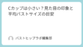 なお、Bカップよりもう少し大きいサイズとして、Cカップの見た目が気になる方もいるかもしれません。Cカップのサイズ感や平均との関係については、こちらの記事でも詳しく解説しています。